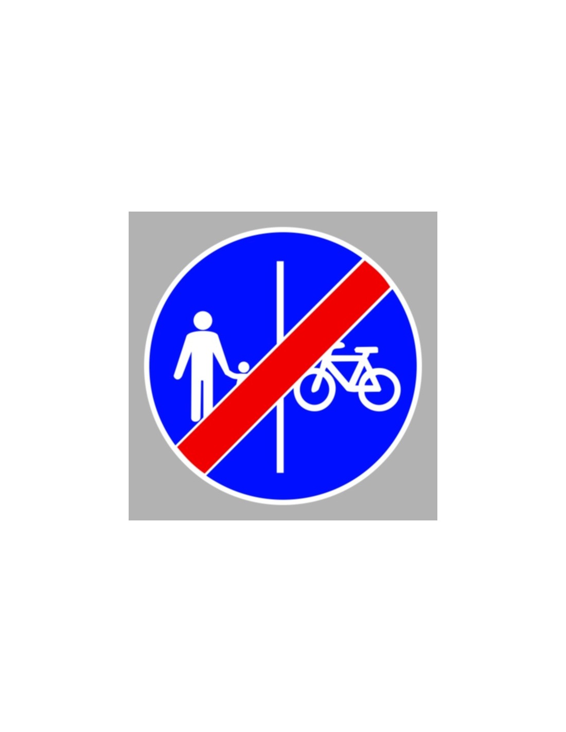A tábla jelzi az osztott gyalog- és kerékpárút végét, ahol a gyalogosok bal oldalon közlekednek. Különböző méretekben és anyagokból elérhető.