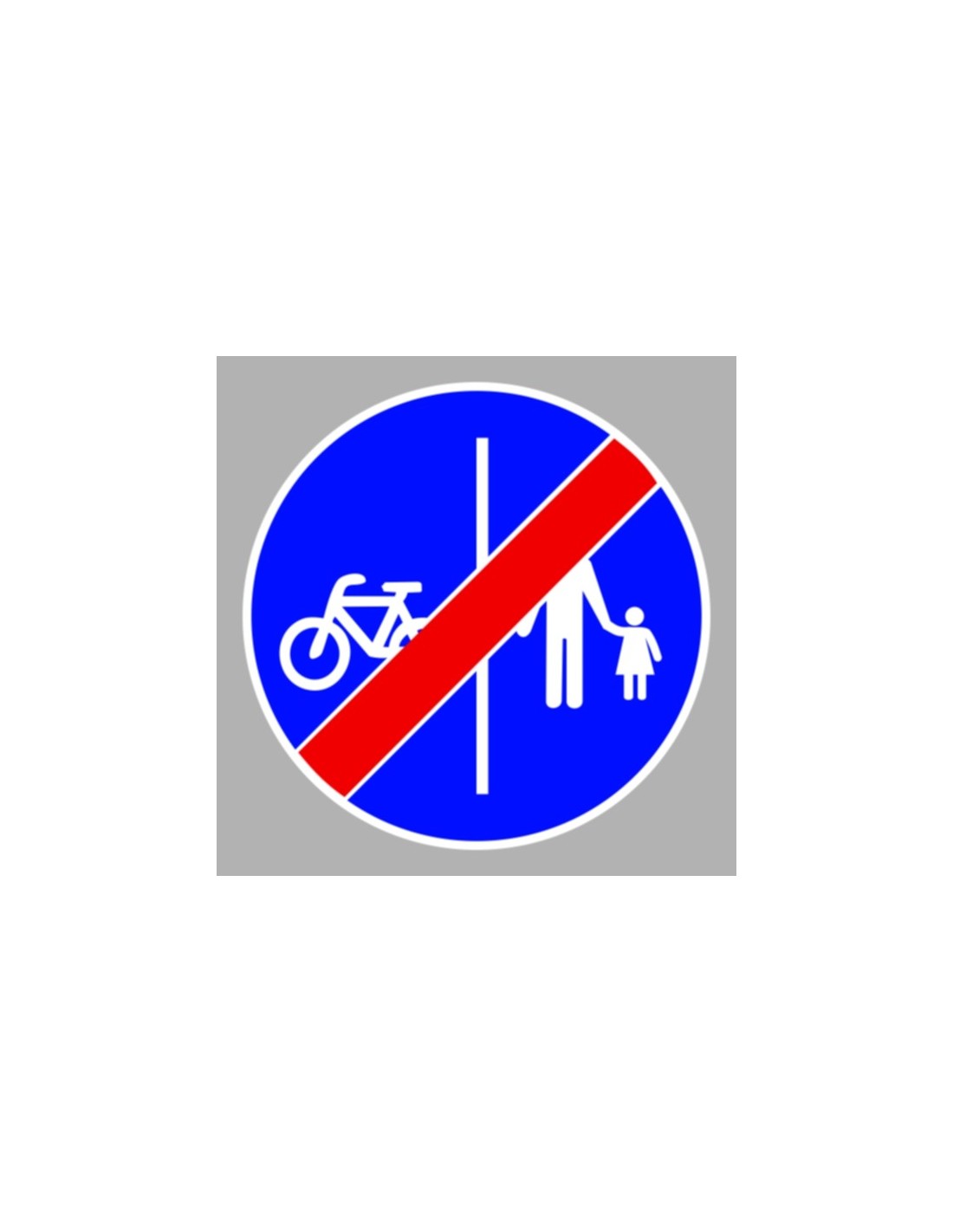A tábla jelzi az osztott gyalog- és kerékpárút végét, ahol a gyalogosok jobbról haladnak. Különböző méretekben és anyagokból elérhető.