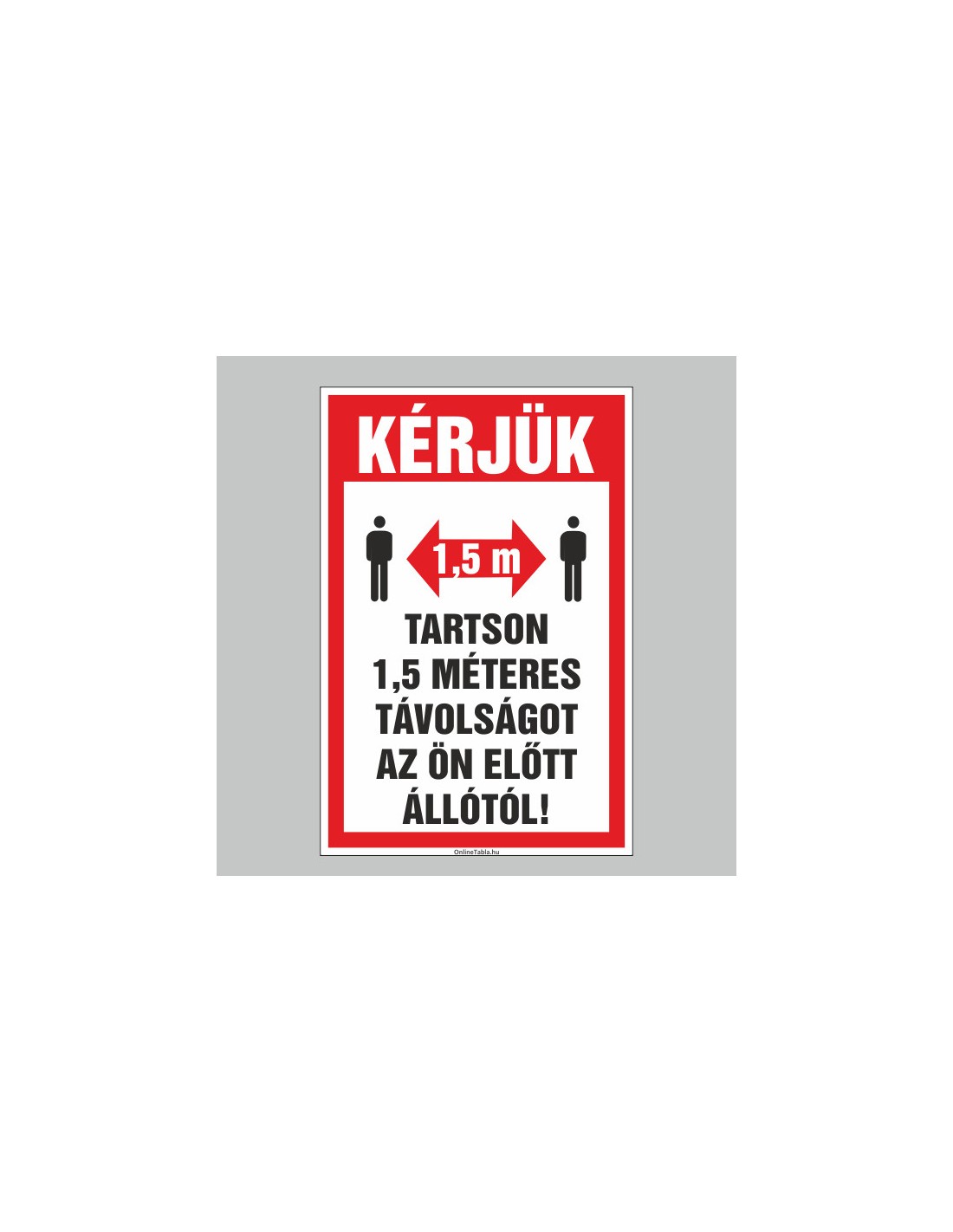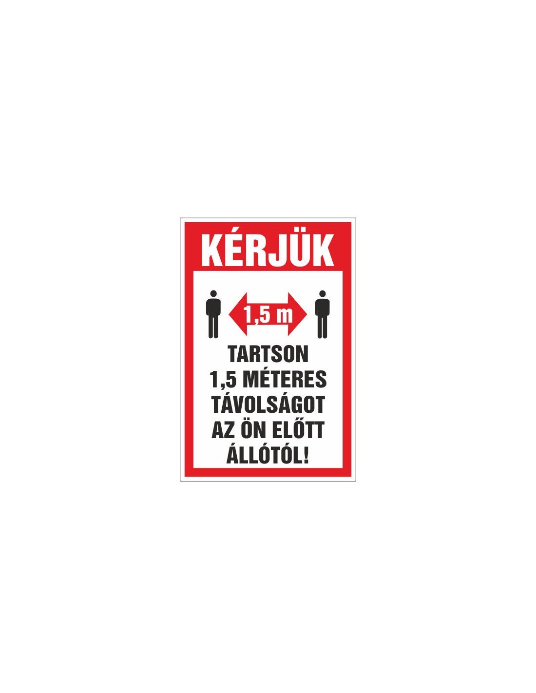 Ez a tábla egyértelműen jelzi a 1,5 méteres távolságtartás szükségességét. Különböző anyagokból és méretekben elérhető.