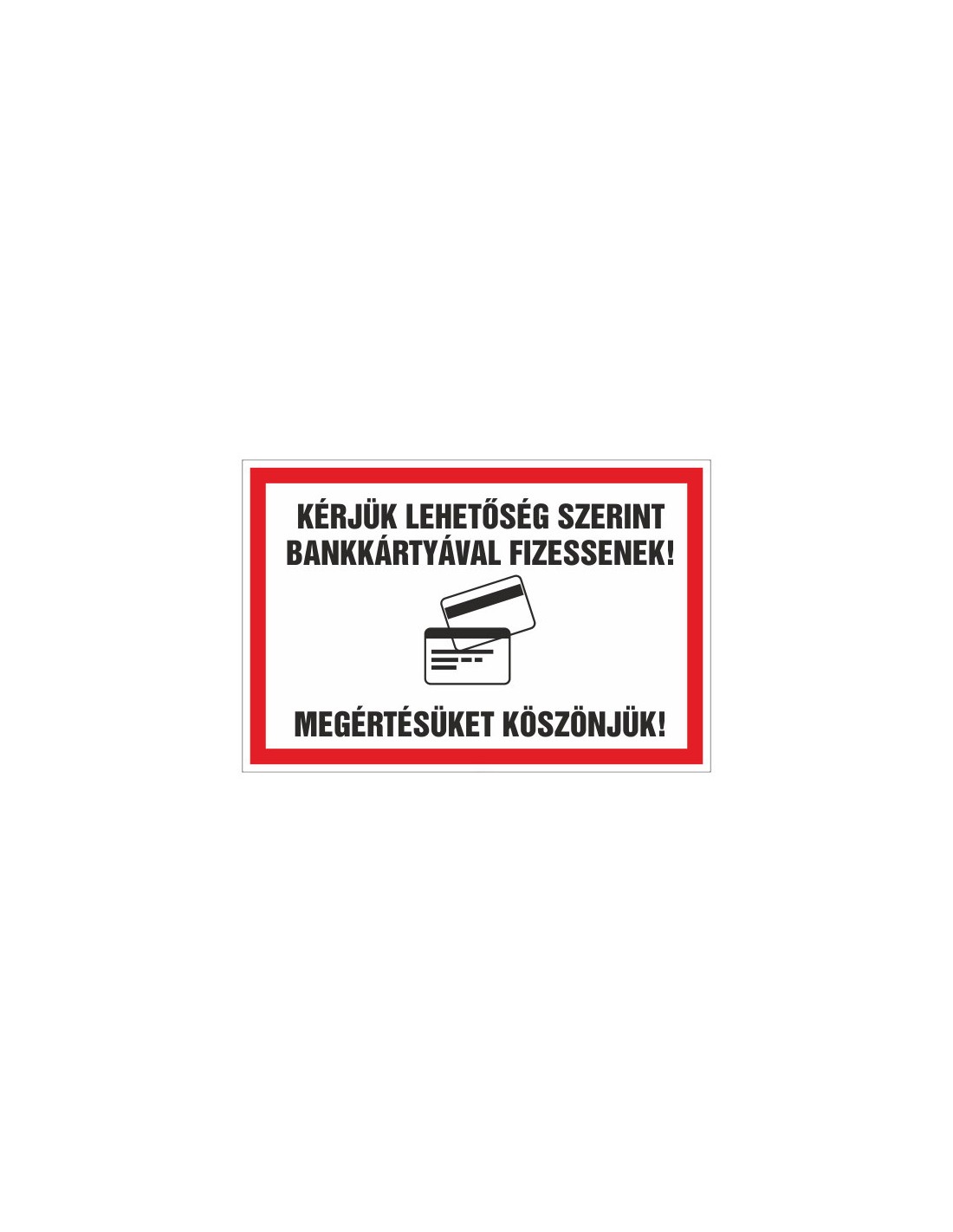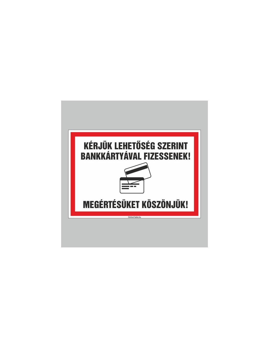 Ez a tábla a bankkártyás fizetés előnyben részesítését kéri. Többféle anyagból és méretben elérhető, jól látható kivitelben készül.