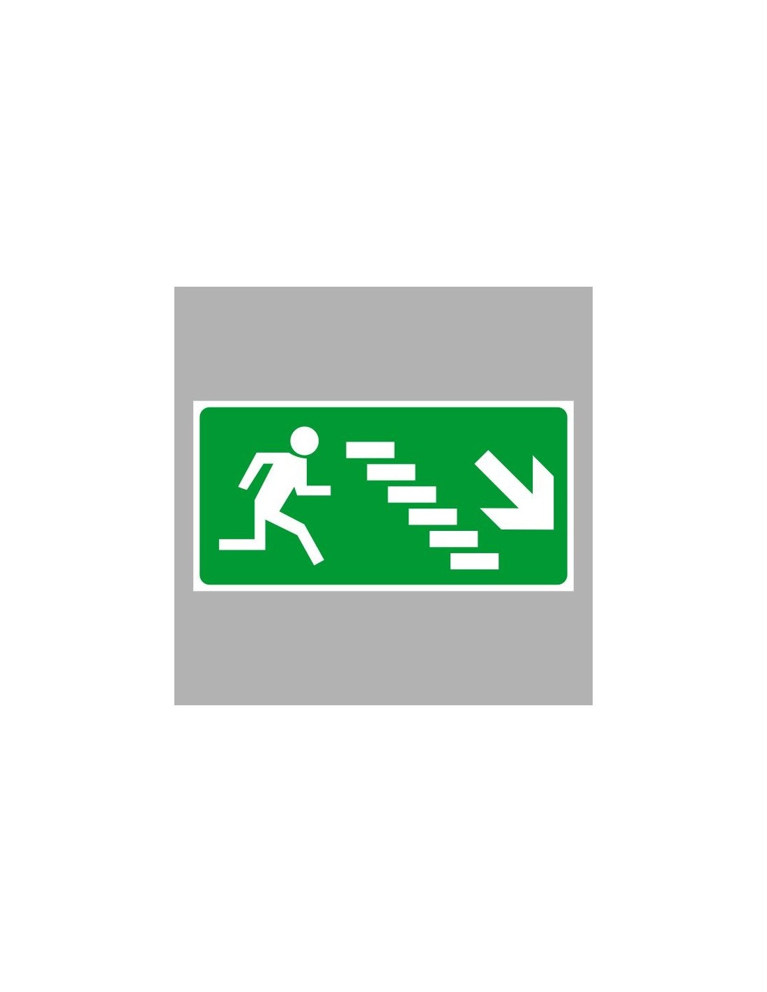 Ez a menekülési jel egy jobbra vezető lépcsőn lefelé mutató irányt jelöl. Utánvilágító és öntapadós vinil anyagokból készül, 30x15 cm méretben.