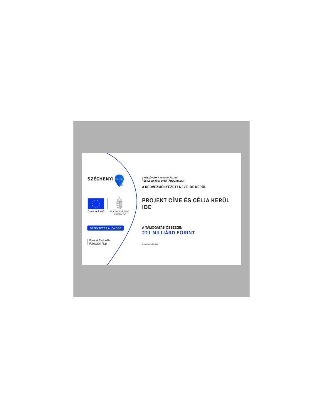 A tábla testreszabható a következő adatokkal: kedvezményezett neve, projekt címe, támogatás összege és a projekt azonosító száma. Ez biztosítja, hogy a projekt adatai jól láthatóan és egyértelműen jelenjenek meg a helyszínen.