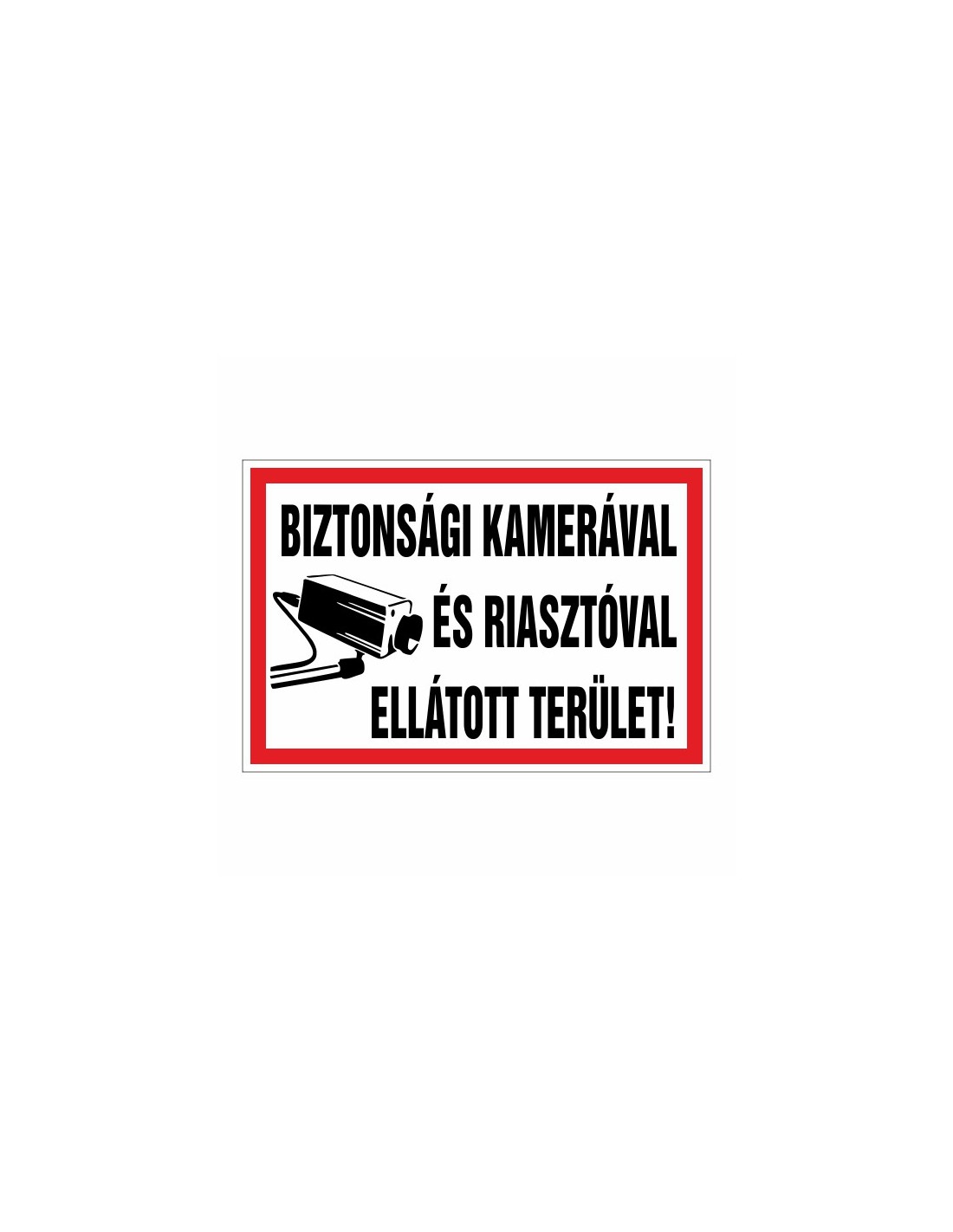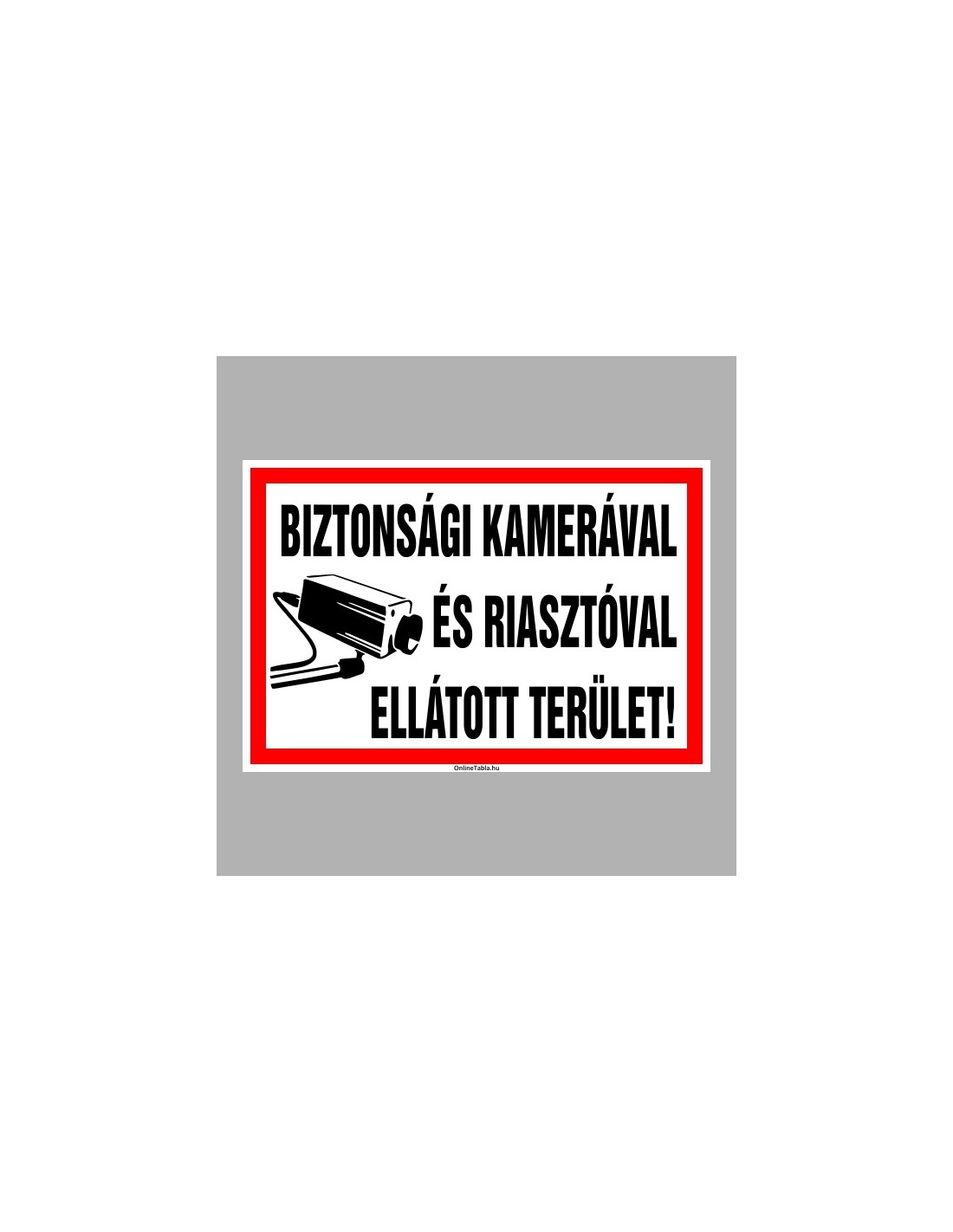 A táblán biztonsági kamerával és riasztóval védett terület jelzése olvasható. Többféle anyagból és méretben elérhető.