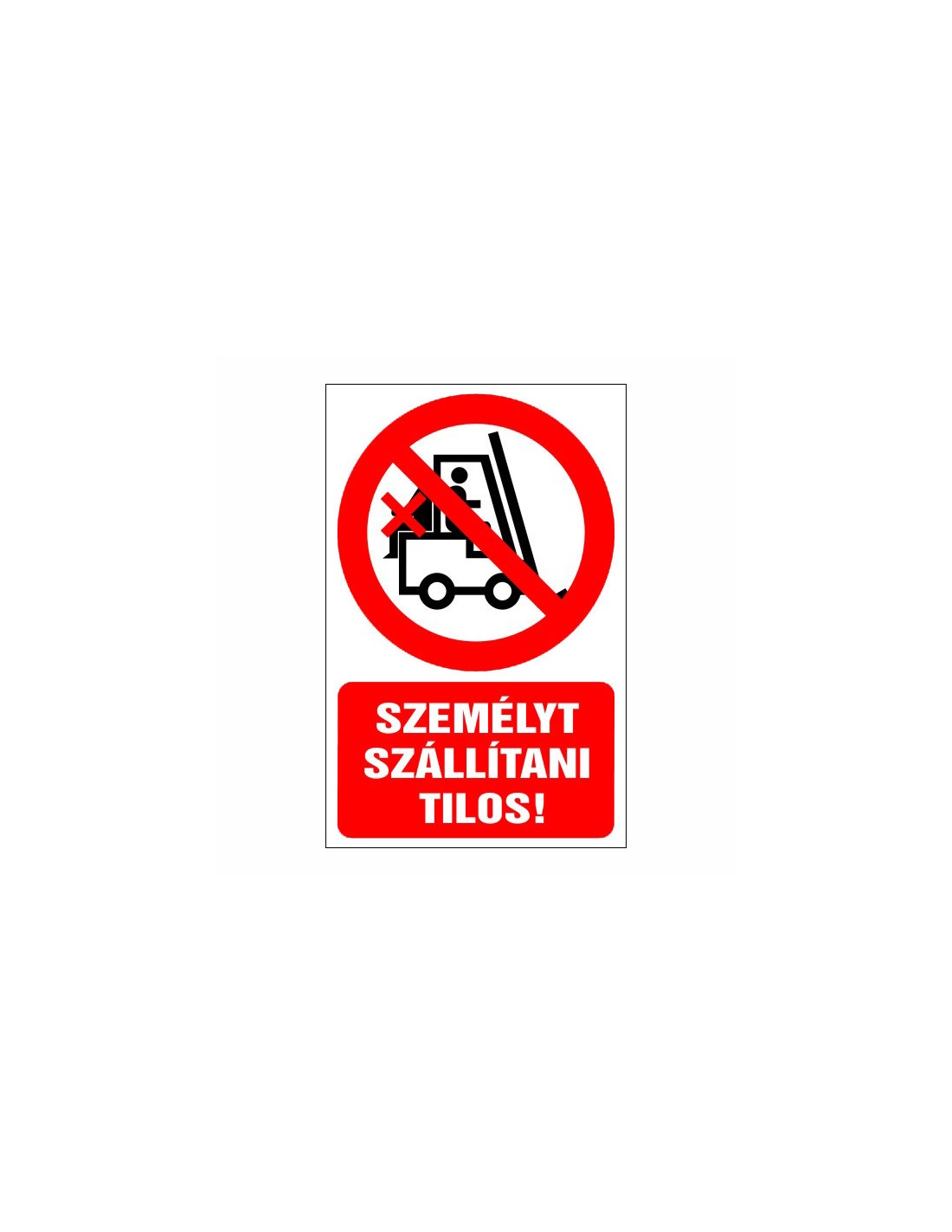 Személyt szállítani tilos! piktogram szöveggel segíti a munkavédelmi szabályok betartását. A jelzés horganyzott lemezből, öntapadós vinilből, műanyaglemezből és szendvicslemezből készül, méretei 16x25 cm-től 30x45 cm-ig terjednek.