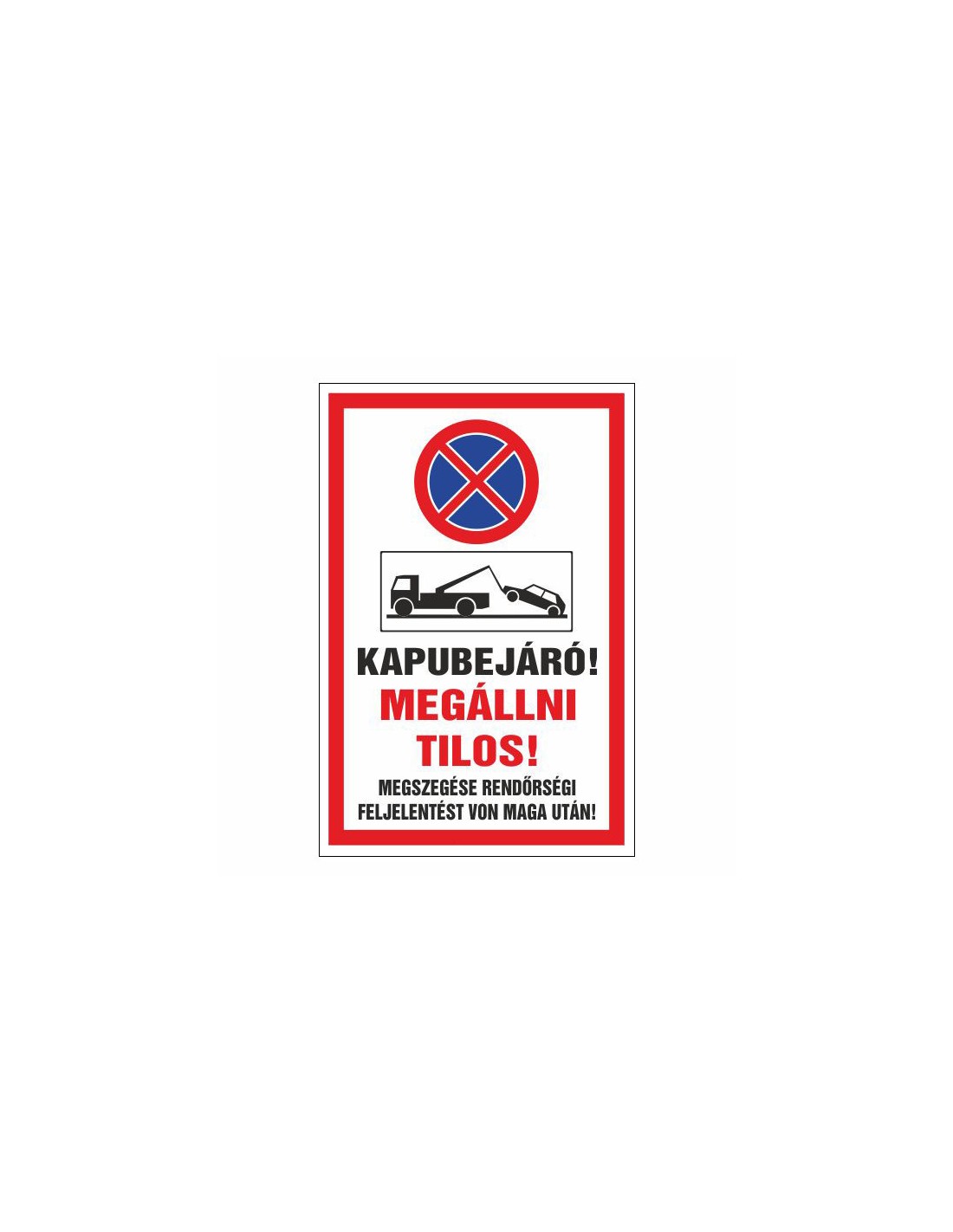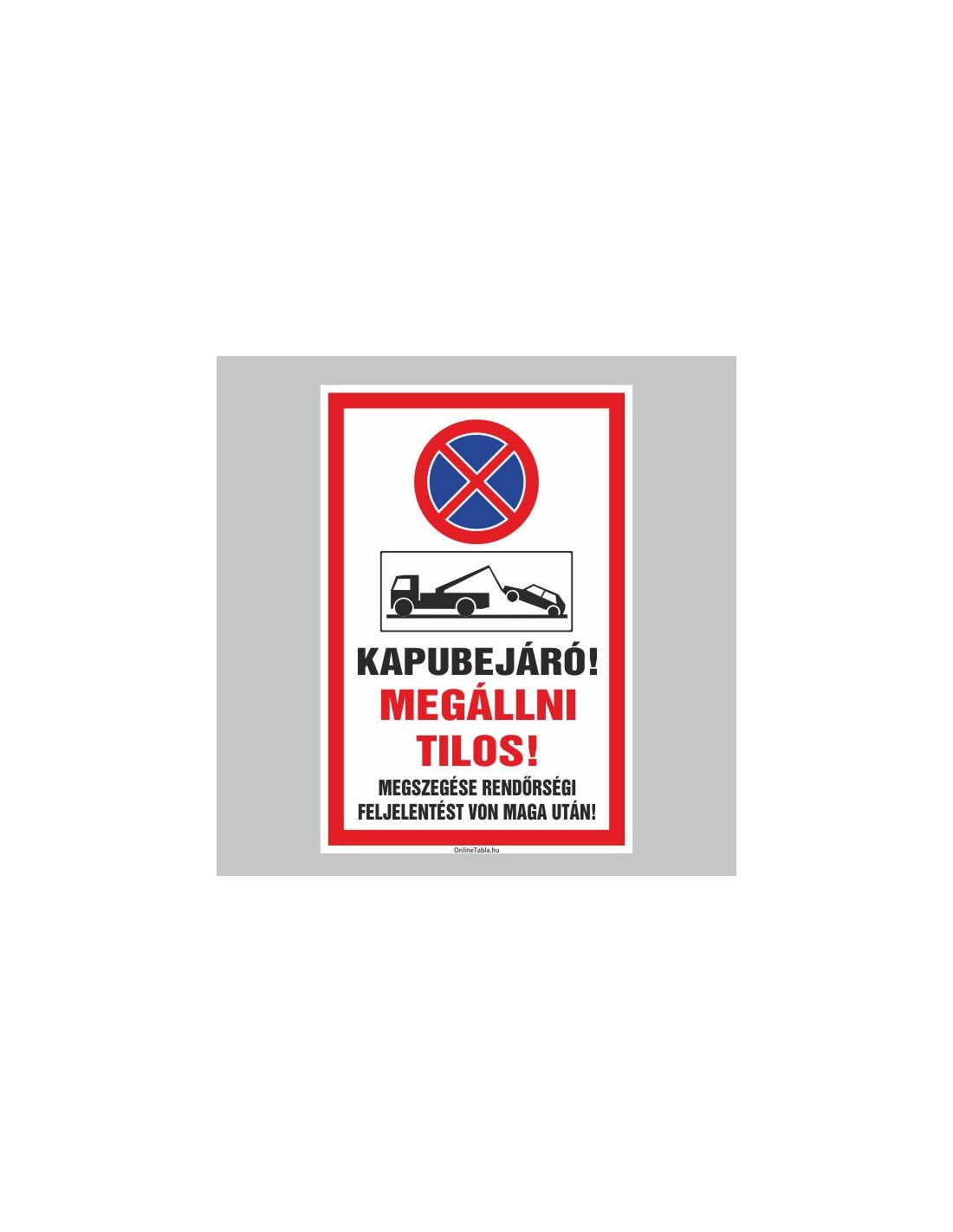 Kapubejáró! Megállni tilos! Megszegése rendőrségi feljelentést von maga után! tábla célja, hogy egyértelműen jelezze a megállási tilalmat a kapubejáró előtt. A tábla különböző anyagokból és méretekben elérhető, így alkalmazkodik a helyszín adottságaihoz.